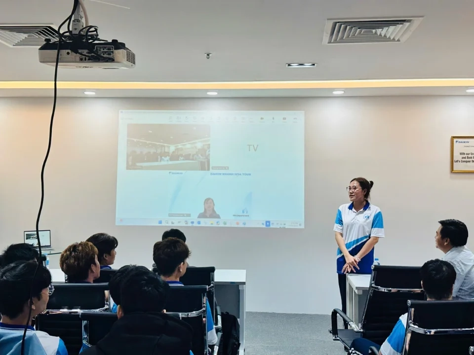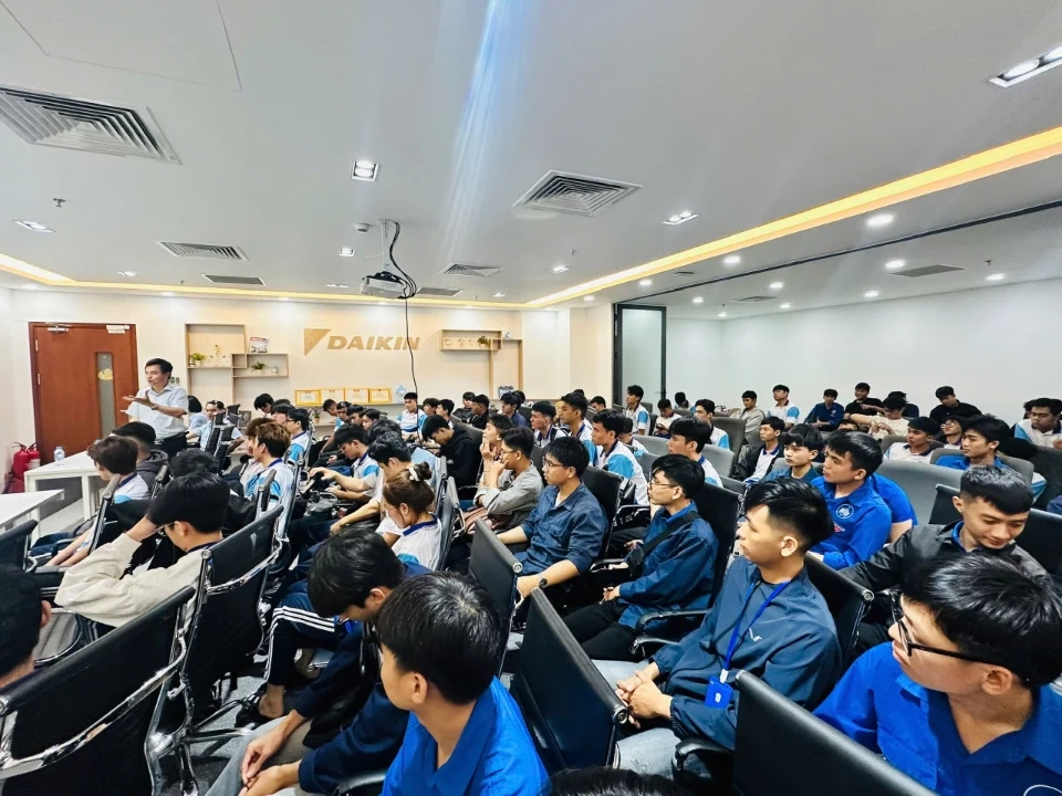 Trong chương trình, sinh viên đã có cơ hội tìm hiểu tổng quan về cơ cấu tổ chức và hoạt động của công ty, đồng thời tham quan phòng mẫu trưng bày các hệ thống điều hòa không khí (ĐHKK) dân dụng, hệ thống điều hòa trung tâm VRV cùng khu vực làm việc tại văn phòng Daikin. Qua đó, các em được tiếp cận trực tiếp với các công nghệ và giải pháp điều hòa không khí hiện đại đang được ứng dụng trong thực tế.